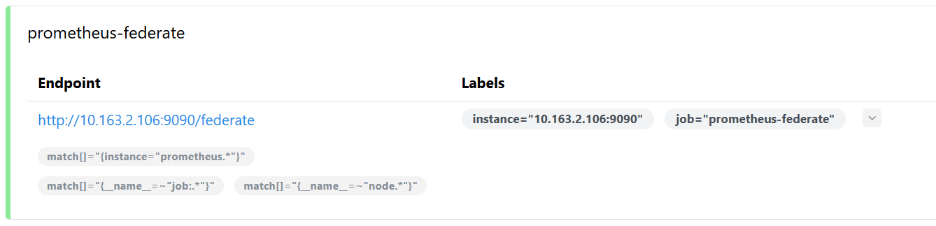 vim /usr/local/prometheus-3.5.0.linux-amd64/prometheus.yml scrape_configs: ... - job_name: 'prometheus-federate' scrape_interval: 10s honor_labels: true metrics_path: '/federate' params: 'match[]': - '{instance="prometheus.*"}' - '{__name__=~"job:.*"}' - '{__name__=~"node.*"}' static_configs: - targets: ["10.163.2.106:9090"] systemctl restart prometheus.service
